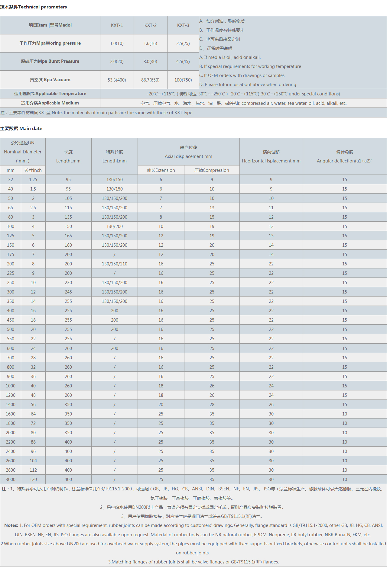 注:1、特殊要求可按用戶圖紙制作,可選配(GB、JB、HG、CB、ANSI、DIN、BSEN、NF、EN、JIS、 等)法蘭標(biāo)準(zhǔn)生產(chǎn)。橡膠球體可做天然橡膠、三元乙丙橡膠、氯丁橡膠、丁基橡膠、丁晴橡膠、氟橡膠等。 2、懸空給水使用DN200以上產(chǎn)品,管道必須有固定支撐或固定托架,否則產(chǎn)品應(yīng)安裝防拉脫裝置。 3、用戶使用橡膠接頭,對應(yīng)法蘭應(yīng)是閥門法蘭。 Notes: 1. For OEM orders with special requirement, rubber joints can be made according to customers' drawings. Generally, flange standard is, other GB, JB, HG, CB, ANSI, DIN, BSEN, NF, EN, JIS, flanges are also available upon request. Material of rubber body can be NR natural rubber, EPDM, Neoprene, IIR butyl rubber, NBR Buna-N, FKM, etc. 2.When rubber joints size above DN200 are used for overhead water supply system, the pipes must be equipped with fixed supports or fixed brackets, otherwise control units shall be installed on rubber joints. 3.Matching flanges of rubber joints shall be valve flanges or flanges. |