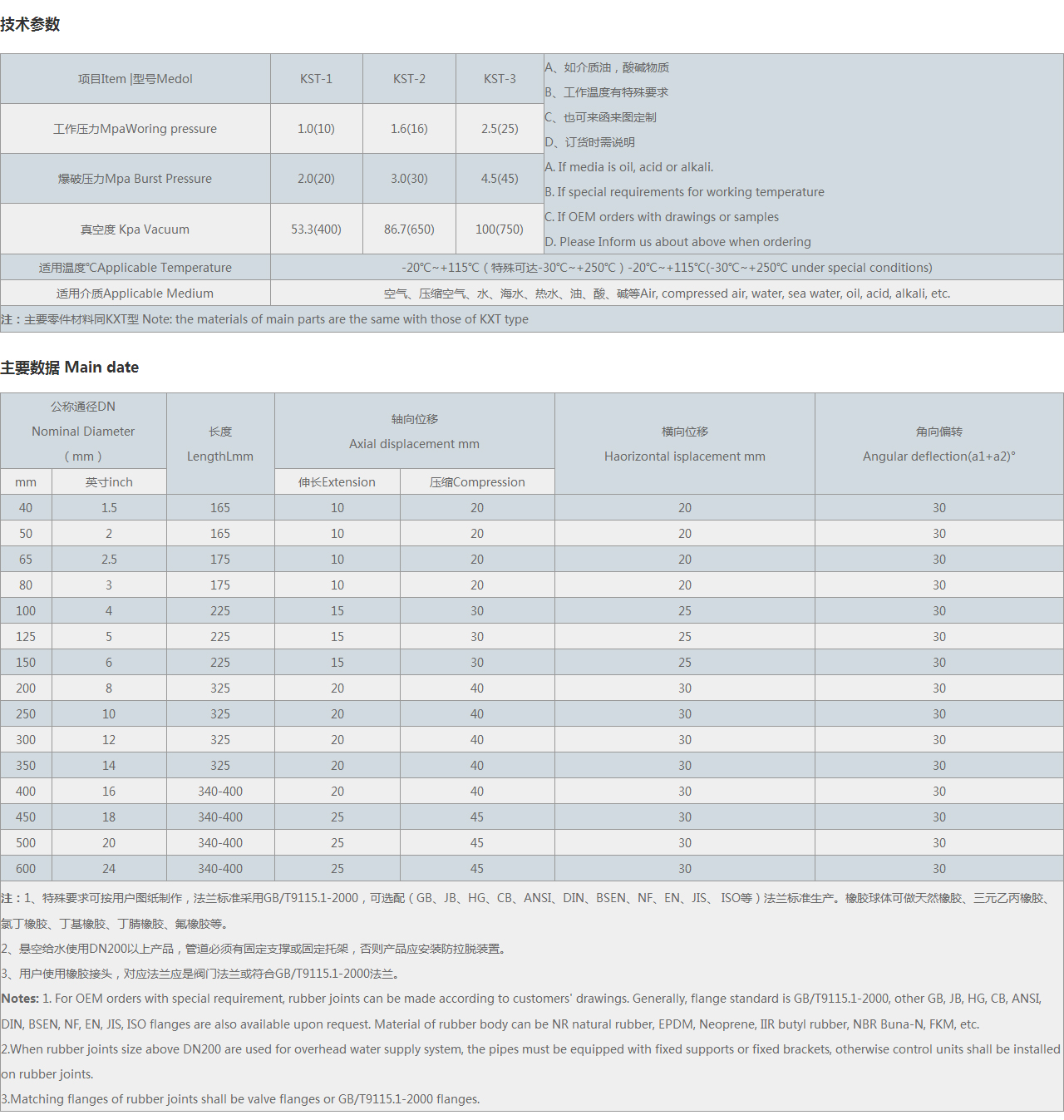 | 注:1、特殊要求可按用戶圖紙制作,可選配(GB、JB、HG、CB、ANSI、DIN、BSEN、NF、EN、JIS、 等)法蘭標(biāo)準(zhǔn)生產(chǎn)。橡膠球體可做天然橡膠、三元乙丙橡膠、氯丁橡膠、丁基橡膠、丁腈橡膠、氟橡膠等。 2、懸空給水使用DN200以上產(chǎn)品,管道必須有固定支撐或固定托架,否則產(chǎn)品應(yīng)安裝防拉脫裝置。 3、用戶使用橡膠接頭,對(duì)應(yīng)法蘭應(yīng)是閥門法蘭。 Notes: 1. For OEM orders with special requirement, rubber joints can be made according to customers' drawings. Generally, flange standard is , other GB, JB, HG, CB, ANSI, DIN, BSEN, NF, EN, JIS, flanges are also available upon request. Material of rubber body can be NR natural rubber, EPDM, Neoprene, IIR butyl rubber, NBR Buna-N, FKM, etc. 2.When rubber joints size above DN200 are used for overhead water supply system, the pipes must be equipped with fixed supports or fixed brackets, otherwise control units shall be installed on rubber joints. 3.Matching flanges of rubber joints shall be valve flanges or flanges. |